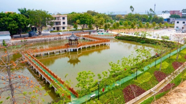 占地面积超1.6万平方米的四会飞鹅岭小游园公园,种植有秋枫、羊蹄甲、小叶榄仁、荔枝树、黄花风铃木、蒲葵等特色绿植约300株,还打造出景观小品,是市民游客拍照留念的热门地标。